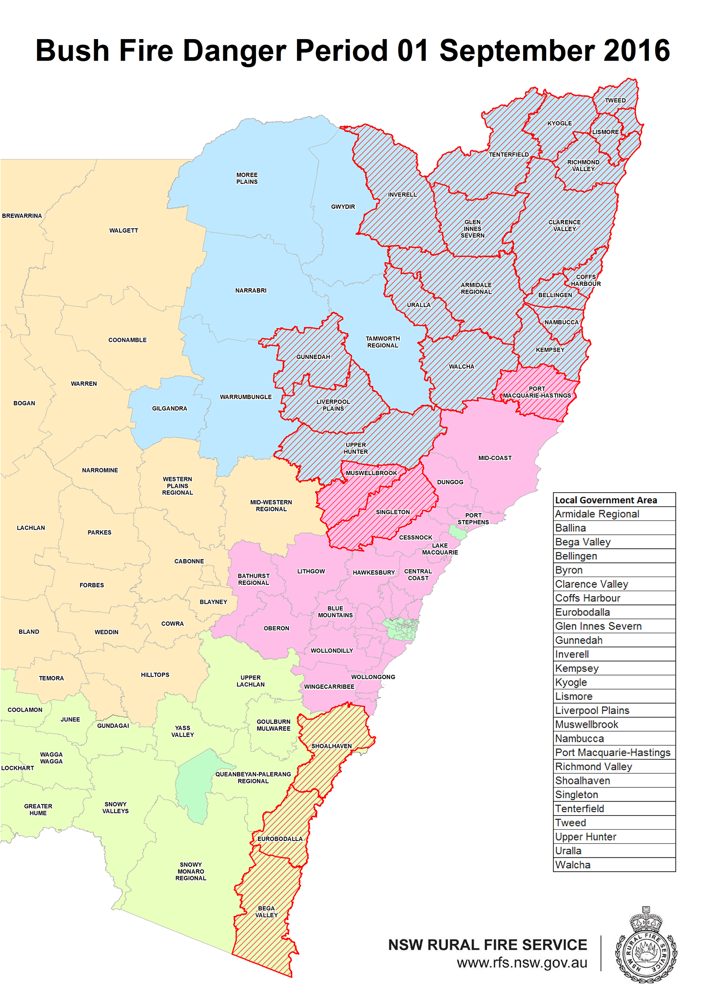 The coloured areas in the map represent NSW RFS Regions. The areas that are now in the bush fire danger period are shaded in red and listed on the right hand side.